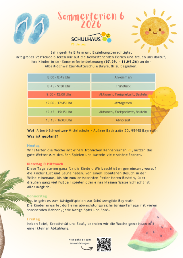 mit großer Vorfreude blicken wir auf die bevorstehenden Ferien und freuen uns darauf, Ihre Kinder in der Sommerferienbetreuung (07.09. - 11.09.26) an der Albert-Schweitzer-Mittelschule Bayreuth zu begrüßen.